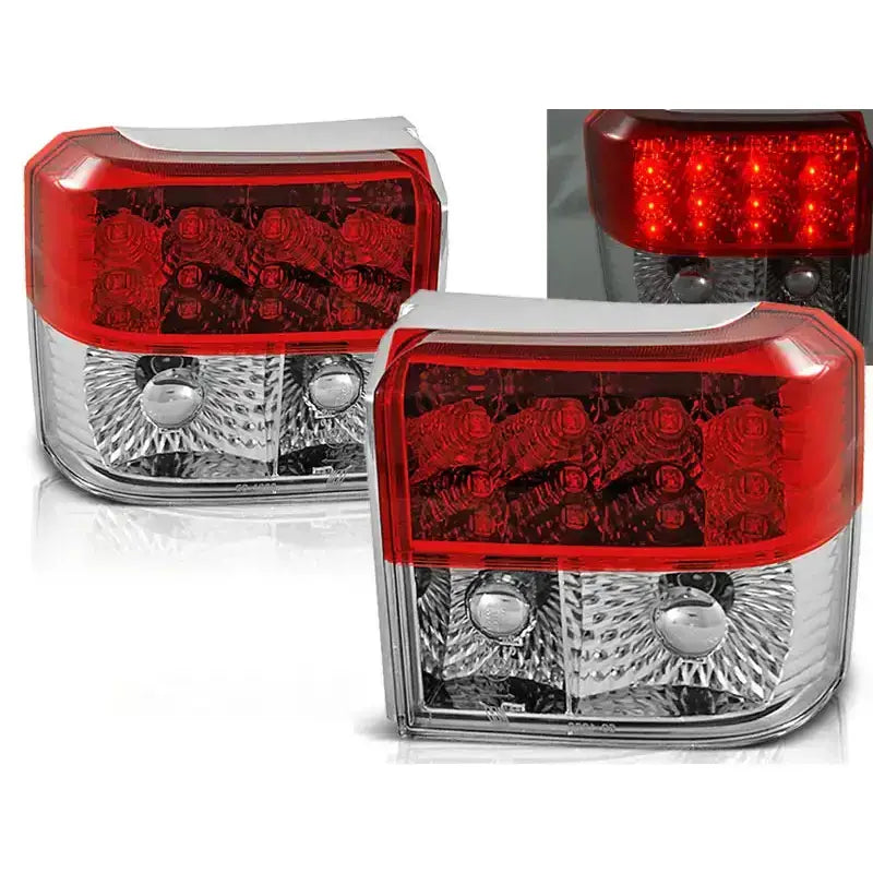 Baklykter Vw T4 90-03.03 med rød og hvit LED, vist fra skrå front på hvit bakgrunn.Baklykt VW T4 90-03.03 Red White LED sett med rød topp og klar bunn mot hvit bakgrunn.