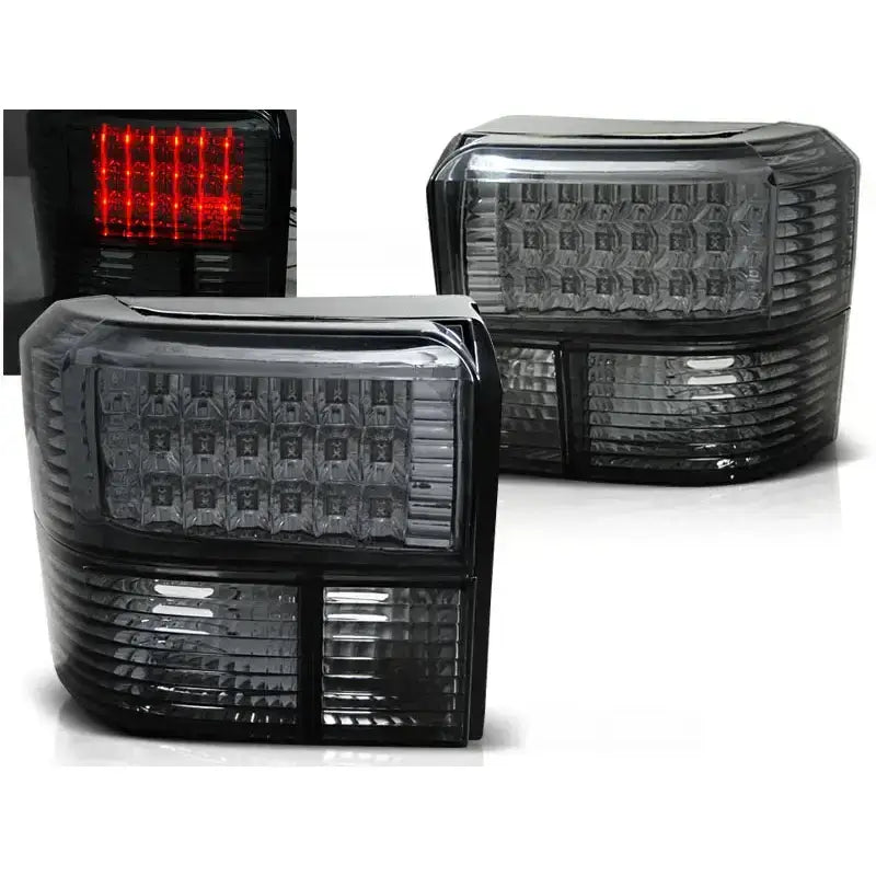 Baklykter Vw T4 Red Smoke LED sett vist fra skrå vinkel med synlige LED-dioder.Baklykt Vw T4 Transporter Caravelle Multivan Red Smoke Led med rød og røykgrå design.