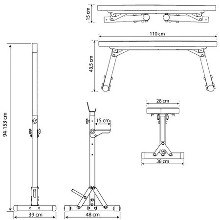 - Typiske mål fra skissetegning: fotbredde stativ ca. 39–48 cm; benkbredde ca. 28–38 cm.
