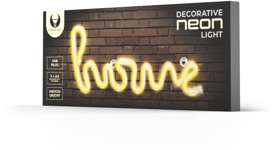Neon LED HOME hvit varm Bat + USB FLNE21 fra Forever Light Barwa er et dekorativt neonskilt som skaper en lun og stemningsfull atmosfære i alle typer rom. Skiltet lyser i en varm hvit fargetone og gir en jevn, myk glød som fremhever interiøret uten å virke skarp eller blendende. Det moderne og stilrene HOME-designet gjør at dette neonskiltet passer like godt som blikkfang på en hylle i stuen, som neonskilt home til stue, som veggdekor på soverom eller som dekorativt HOME-neonskilt med hvitt lys i gang og oppholdsrom.
