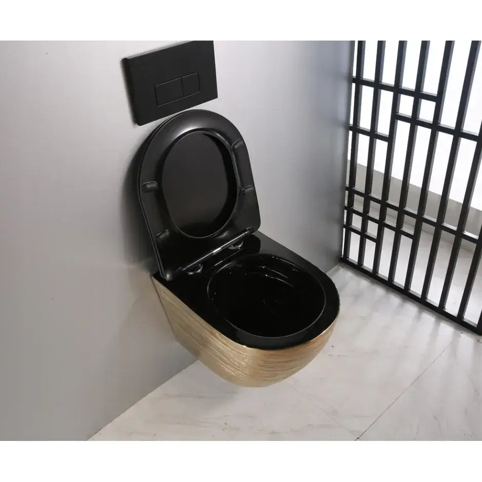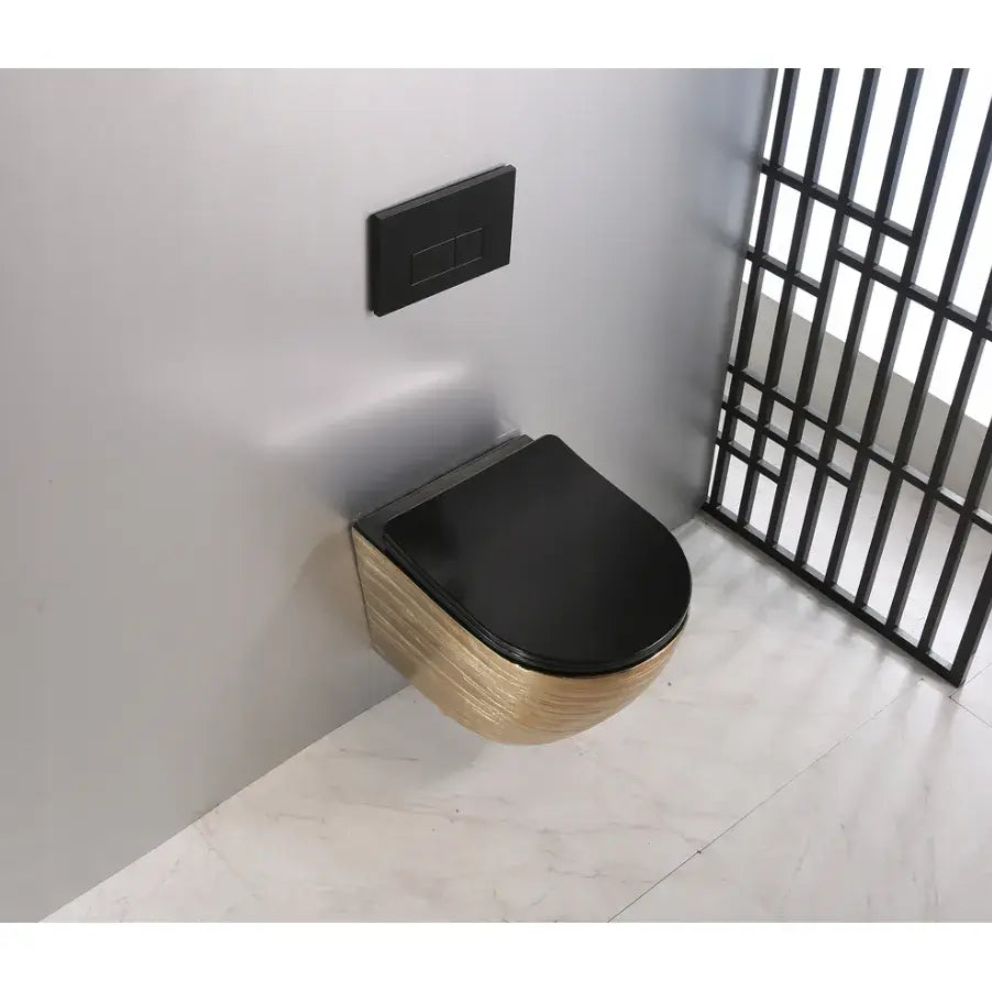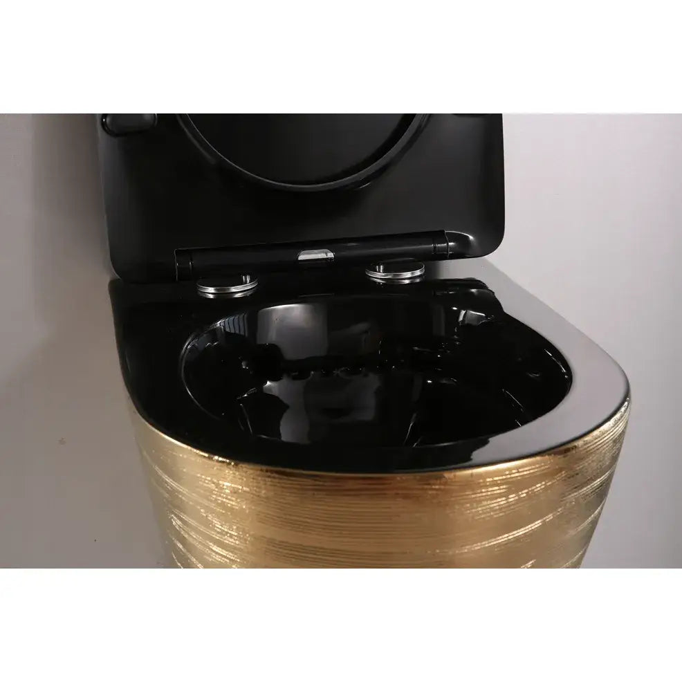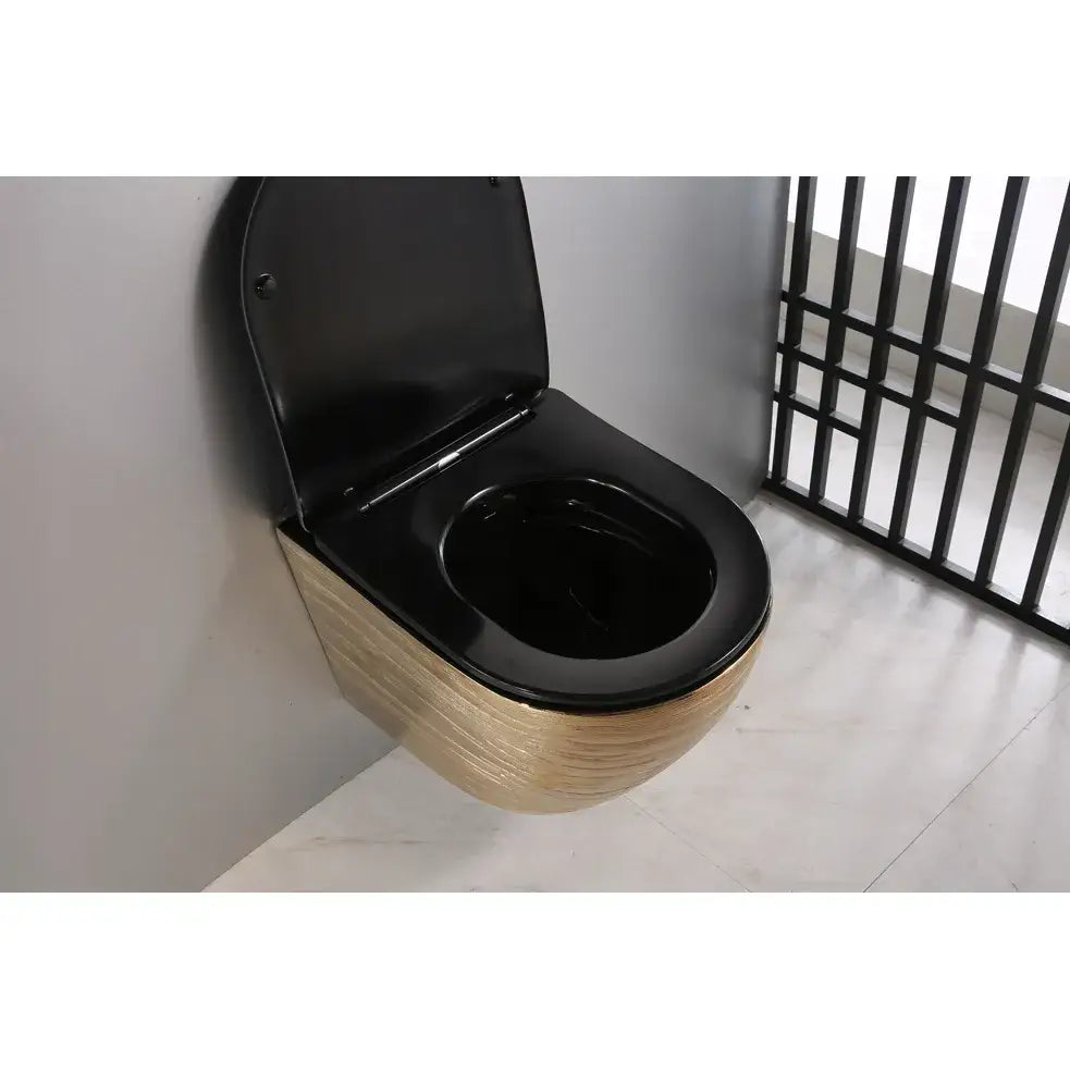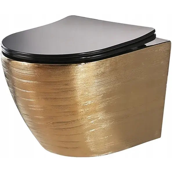 Vi presenterer det vakre keramiske toalettet ARBO, modell GOLD 05B. Denne gylne toalettskålen med strukturert overflate leveres med et slankt sete i svart matt finish, som har en matchende svart innside.