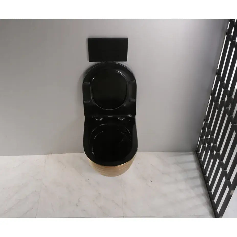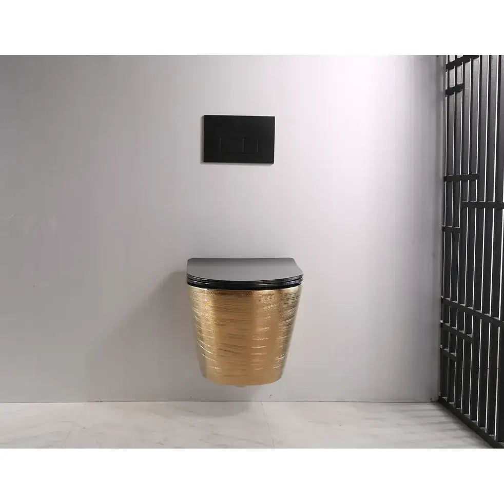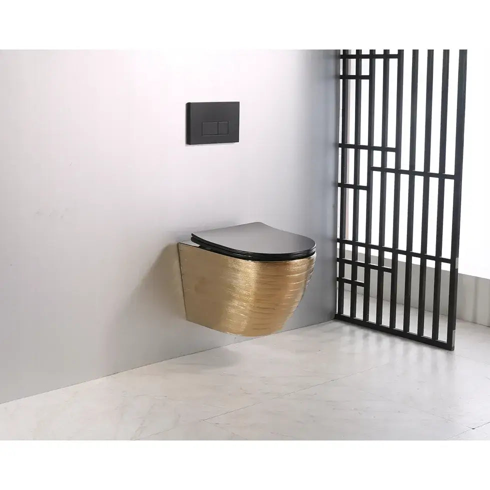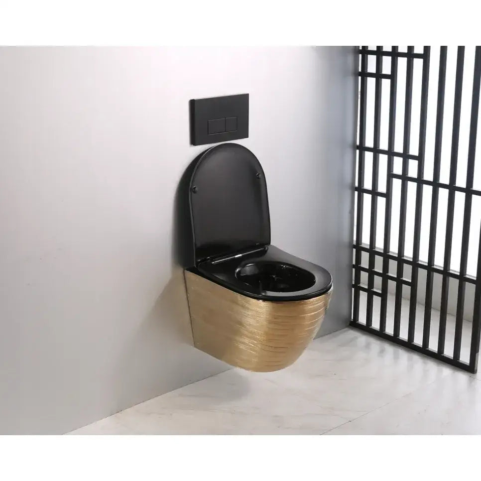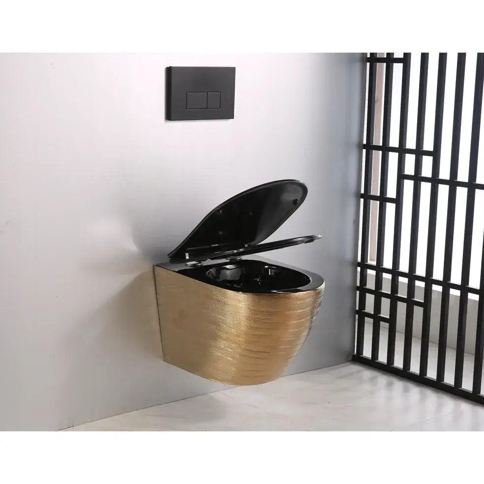 Vi presenterer det vakre keramiske toalettet ARBO, modell GOLD 05B. Denne gylne toalettskålen med strukturert overflate leveres med et slankt sete i svart matt finish, som har en matchende svart innside.