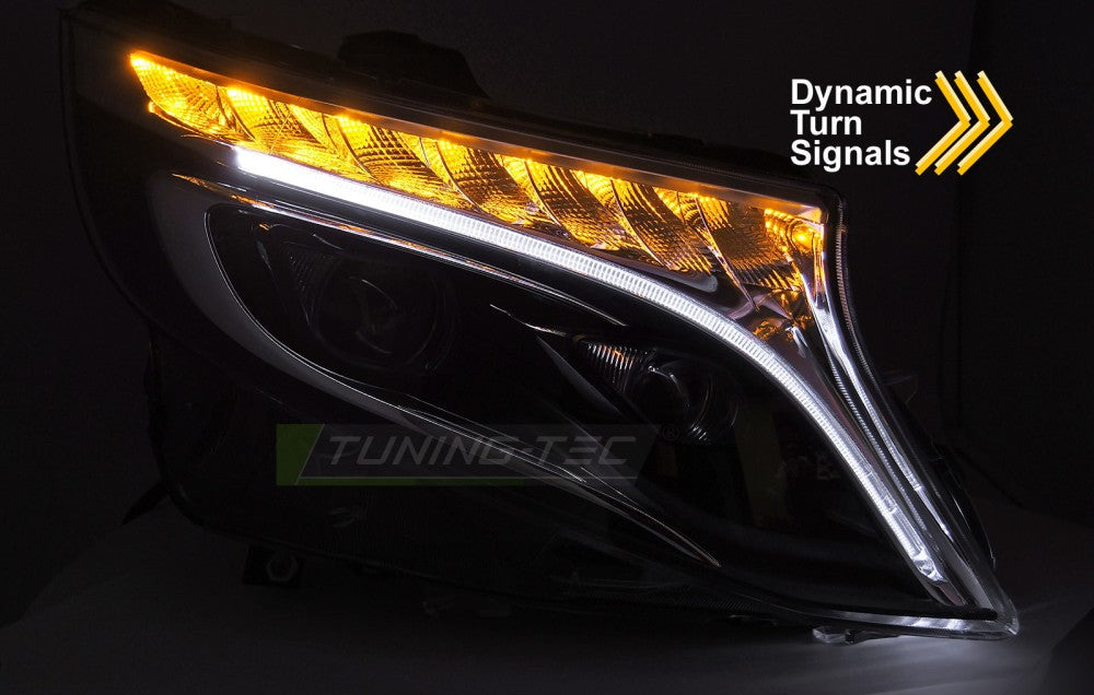 - Frontlykter Mercedes Vito W447 2014–2023 med integrert DRL (dagkjørelys) og dynamiske blinklys.