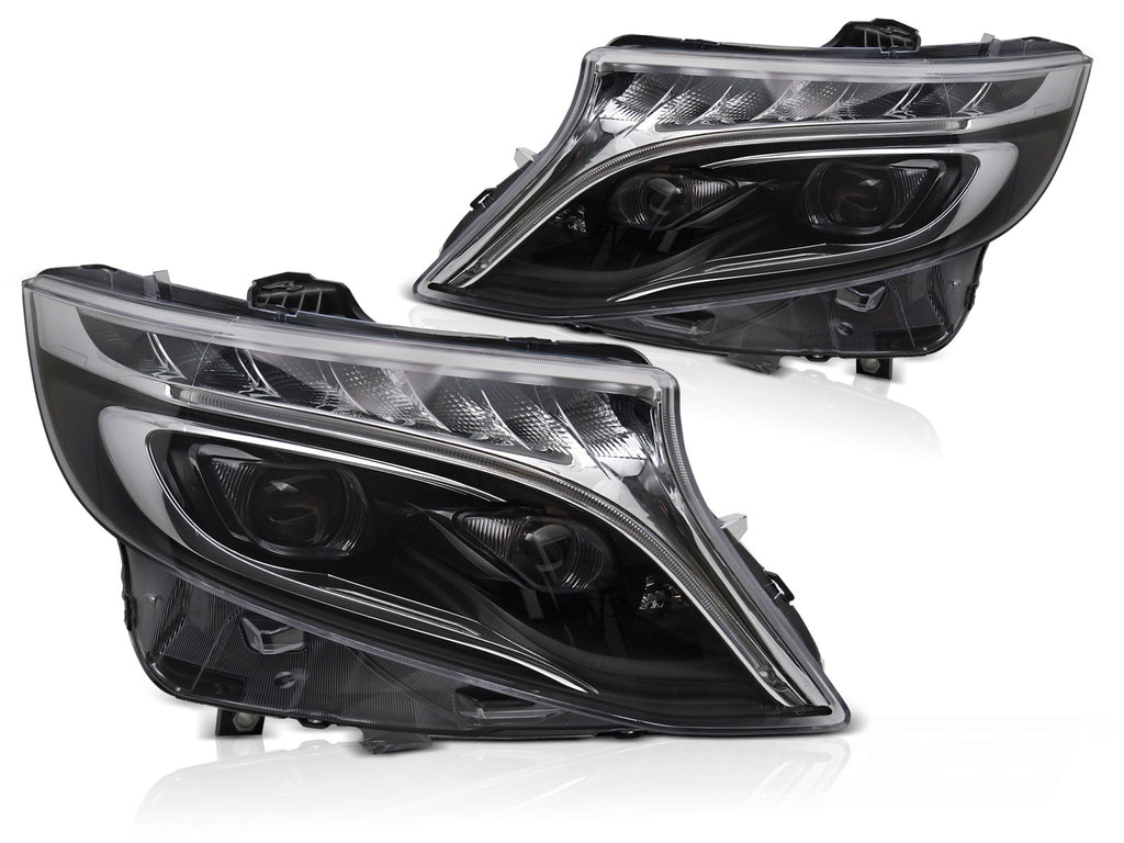- 1 sett (venstre & høyre) Frontlykter Mercedes Vito W447 2014–2023 / LED hovedlykter Mercedes V-klasse W447 2014–2023 i svart utførelse.