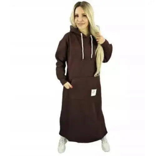 AGATA AGR1045 kommer i fargen brun, med rund hals og lang arm. Denne multifunksjonelle hoodie-kjolen forvandler hverdagsantrekket og gir maksimal komfort.