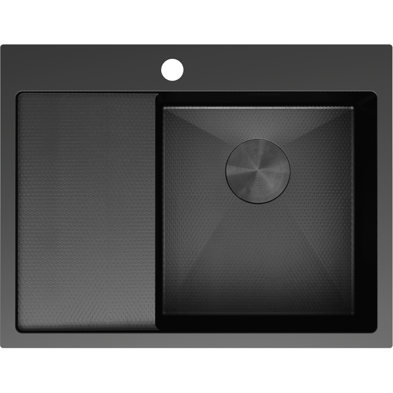 Vasken er produsert i rustfritt stål AISI 304 og har en elegant svart overflate med struktur i «honningkakemønster», som gir et eksklusivt uttrykk og samtidig bidrar til god slitestyrke. Den kombinerer praktisk utforming med gjennomtenkte detaljer som skjult overløp, hull for kjøkkenbatteri og kort avrennerflate for enkel tørking av servise og kjøkkenredskaper.