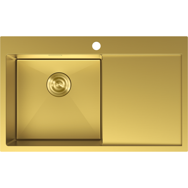 Vasken er produsert i rustfritt stål AISI 304 med en glatt overflate i eksklusiv gullfarge. Denne stålvasken i gull gir et markant, moderne uttrykk og passer perfekt i kjøkken hvor man ønsker en gullfarget kjøkkenvask som blikkfang. Den rektangulære kummen har presise linjer med lett avrundede hjørner (R10), som kombinerer stilrent design med enkel rengjøring.