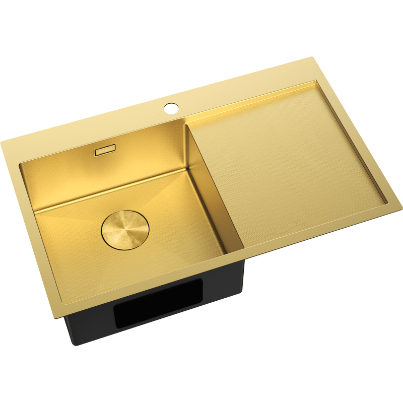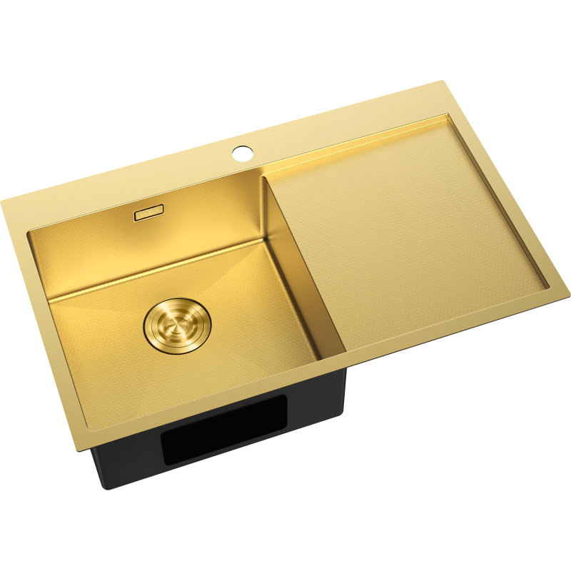 Mexen Exar er en elegant kjøkkenvask i stål med én kum og lang avrenner, beregnet for nedfelling i benkeplate i venstreversjon (kum til høyre, avrenner til venstre). Vasken er produsert i høykvalitets rustfritt stål AISI 304 og har et eksklusivt gullfarget design som gir kjøkkenet et moderne og luksuriøst uttrykk.
