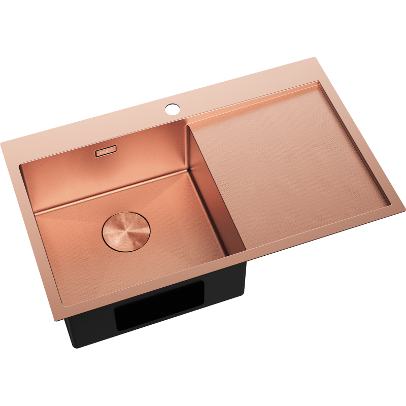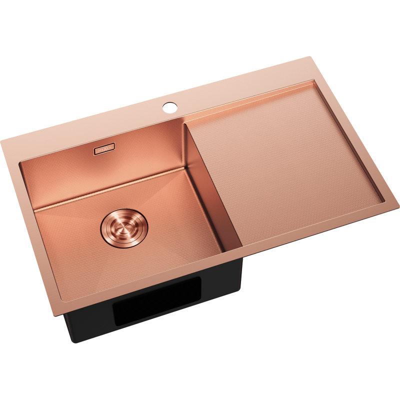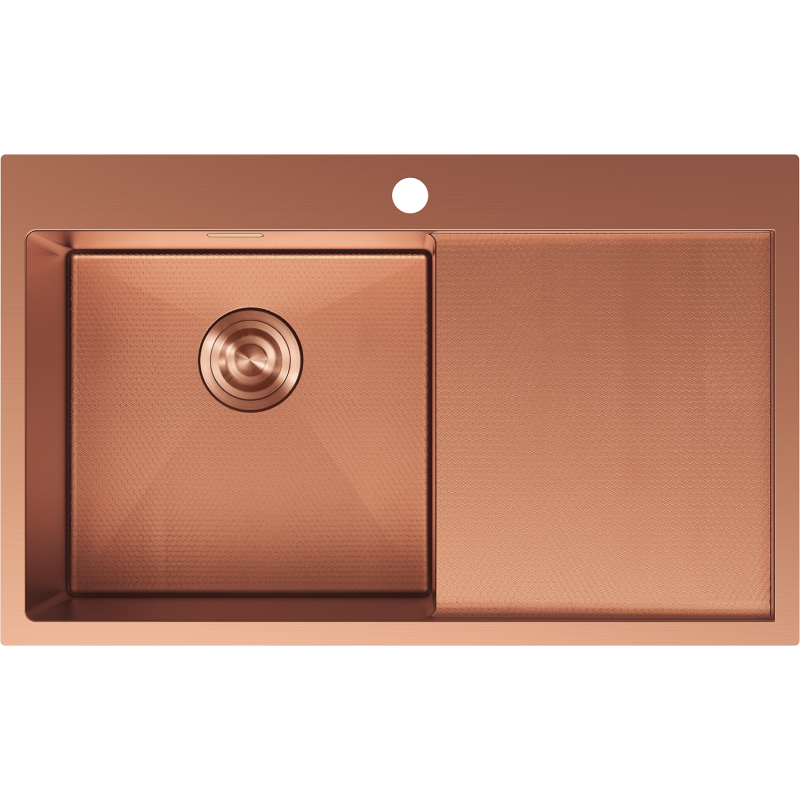 Vasken er produsert i rustfritt stål AISI 304, kjent for svært god motstand mot korrosjon, slag, riper, misfarging, høy temperatur og termisk sjokk. Overflaten har en dekorativ bikubemønster som gir et moderne uttrykk og samtidig gjør rengjøringen enklere. Hele løsningen med nedfelt kjøkkenvask i stål er utført i en raffinert kobberfarge, inkludert det synlige avløpsområdet.