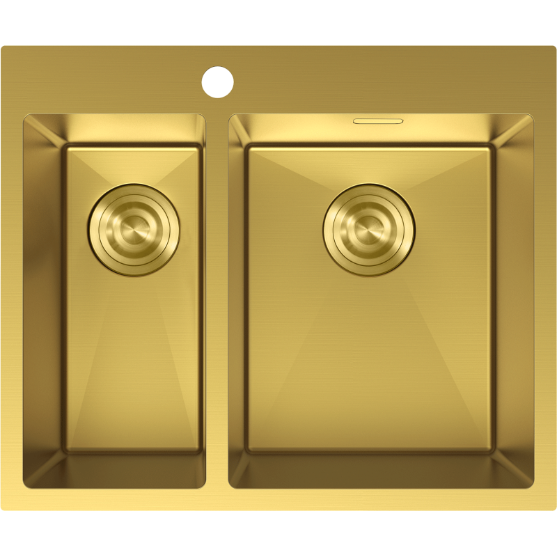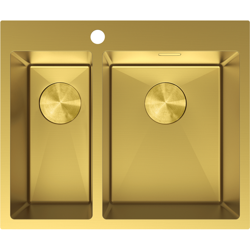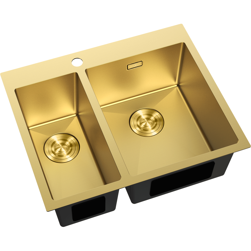 Vasken er en kompakt og praktisk kjøkkenvask uten avrenner med totalmål 610 x 510 x 200 mm, utformet som en 1,5-kums løsning med én større og én mindre kum. Den glatte overflaten i gull gir et eksklusivt uttrykk, og den matchende gullfargede utførelsen på avløps- og sifondelene skaper et helhetlig og stilrent utseende på kjøkkenbenken.
