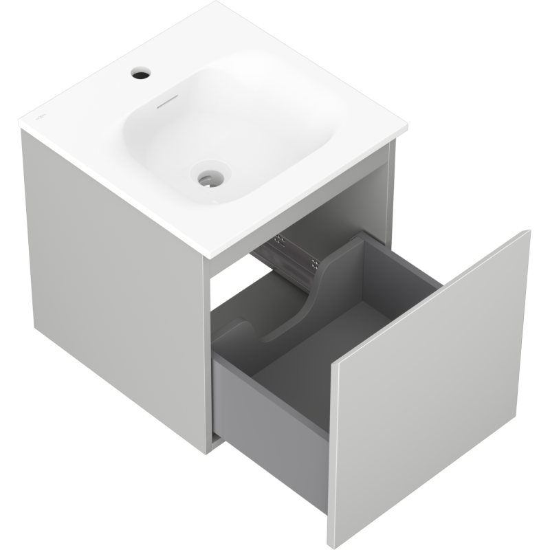 Mexen Orio 45 cm servantskap med vask Vela er et moderne og kompakt baderomsmøbel med skuff, utviklet spesielt for mindre bad der hver centimeter teller. Dette baderomsskap med servant kombinerer funksjonalitet med et stilrent, matt uttrykk i grått og hvitt, og gir et helhetlig og elegant preg på baderommet.