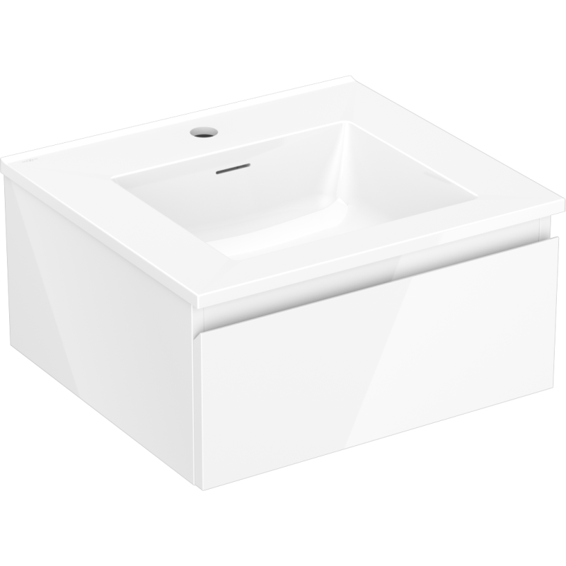 Servantskapet har en bredde på 50 cm og er utformet i hvit høyglans, noe som gir et lyst og moderne uttrykk som passer inn i de fleste typer hvit baderomsinnredning. Den kompakte høyden og dybden gjør det ideelt der plassen er begrenset, samtidig som du får god oppbevaringsplass i den romslige skuffen. Som veggmontert servantskap gir det et luftig inntrykk og gjør det enklere å holde rent under møbelet.