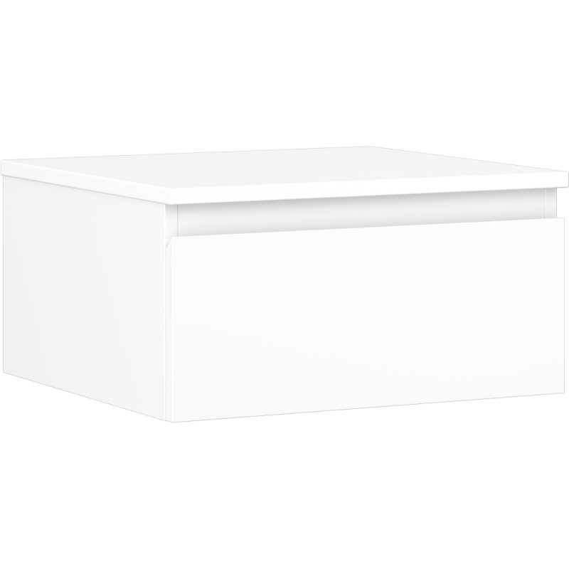 Den medfølgende hvit matte topplaten er dimensjonsmessig tilpasset skapet og danner en stabil og estetisk base for en toppmontert servant. Kombinasjonen av kompakte mål, vegghengt montering og praktisk skuffeløsning gjør dette baderomsskapet Mexen til et svært funksjonelt valg i moderne baderomsinnredning.