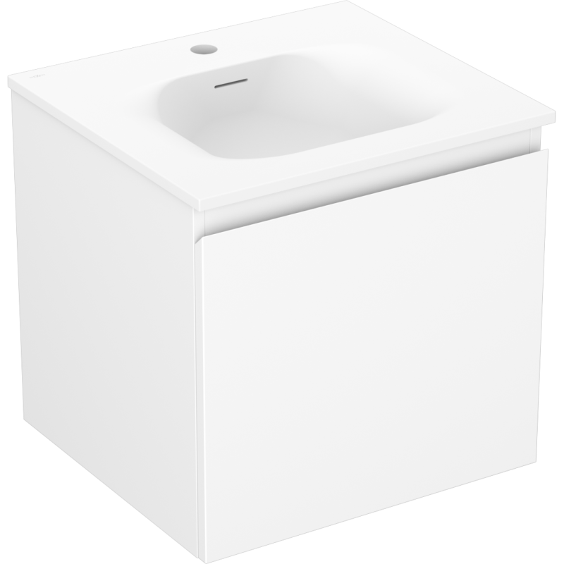 Denne løsningen med servant og skap gir deg en romslig skuff med god oppbevaringsplass til daglige baderomsartikler. Skuffen er utstyrt med demping (funksjon for myk lukking), som sørger for myk og stillegående lukking og øker komforten i hverdagsbruk. Overflaten på møbelet er motstandsdyktig mot UV-stråler, noe som bidrar til at den hvite matte fargen holder seg pen over tid uten å falme.