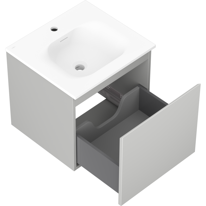 Skapet har en matt grå overflate på både korpus og front, som gir et tidløst og elegant uttrykk. Korpuset er produsert i lakkert plate, mens fronten er laget av lakkert MDF med glatt struktur. Kombinasjonen av det kompakte servantskapet på 50 cm og den tilpassede servanten gir en harmonisk helhet som passer godt inn i moderne baderomsinnredninger.