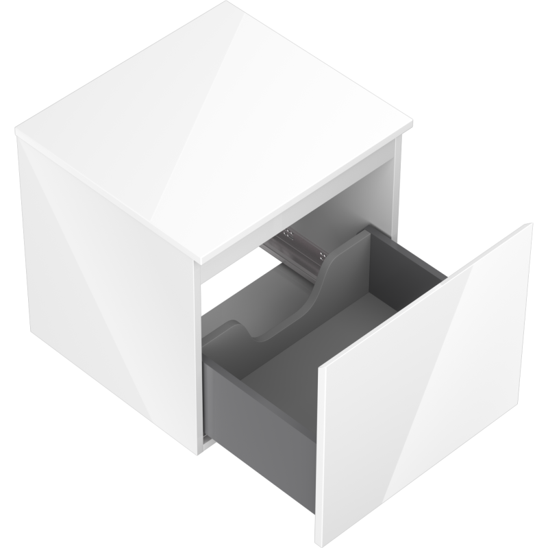 Den glatte, lakkede overflaten i hvit høyglans er enkel å holde ren – smuss og vannsprut tørkes lett bort, noe som er en klar fordel i et aktivt baderomsmiljø. Soft close-systemet bidrar til stille og behagelig bruk, og reduserer slitasje på både skuff og beslag over tid.