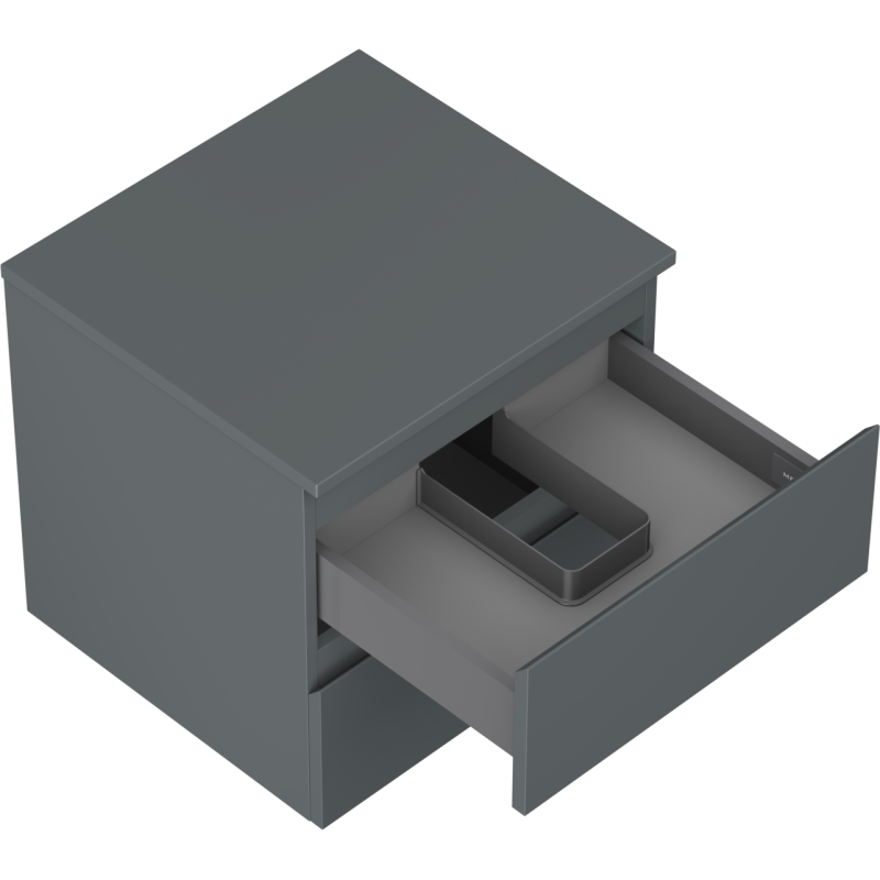 De to romslige skuffene i dette baderomsskap 2 skuffer gir ryddig oppbevaring av toalettsaker, kosmetikk og rengjøringsprodukter, slik at benkeplaten holdes fri og badet ser mer organisert ut. Den glatte, matte overflaten i grafitt matt er lett å tørke av og bidrar til enkel rengjøring i hverdagen. Veggmontert servantskap gir dessuten fri gulvplass under møbelet, noe som både forenkler renhold og gir et luftig og moderne uttrykk på badet.