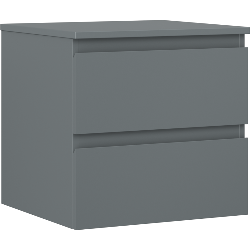 Servantskapet består av et underskap med to romslige skuffer og en tilpasset topplate. Korpus er produsert i lakkert plate, mens frontene er laget av lakkert MDF med glatt overflate, noe som gir et elegant og helhetlig baderomsmøbel i grafitt. Overflatene er UV-resistente, slik at fargen holder seg jevn og motstandsdyktig mot sollys over tid.