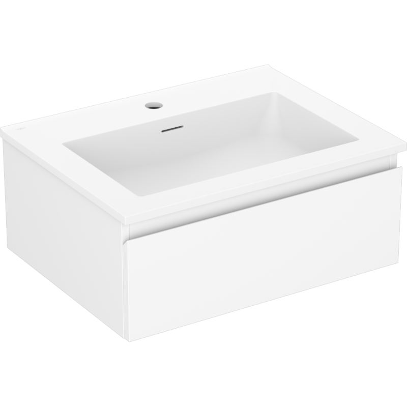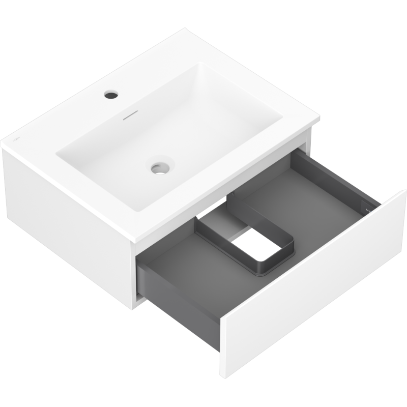 Servantskapet har en bredde på 60 cm, dybde på 46 cm og høyde på 23,5 cm, og gir en kompakt, men praktisk løsning for mindre og mellomstore bad. Korpus er produsert i lakkert plate i hvit matt utførelse, mens fronten er laget av lakkert MDF-plate med glatt struktur. Den medfølgende Otis-servanten i hvit matt konglomerat er nøye tilpasset skapet og gir en helhetlig og elegant baderomsløsning.
