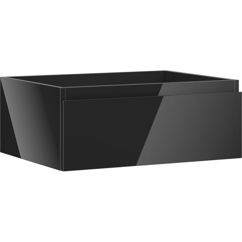 Servantskapet leveres i svart høyglans, både på korpus og front, med en glatt frontflate som understreker det minimalistiske uttrykket. Korpuset er produsert i lakkert plate, mens fronten er laget av lakkert MDF, noe som gir en stabil og slitesterk konstruksjon som er godt egnet som servantskap til bad.