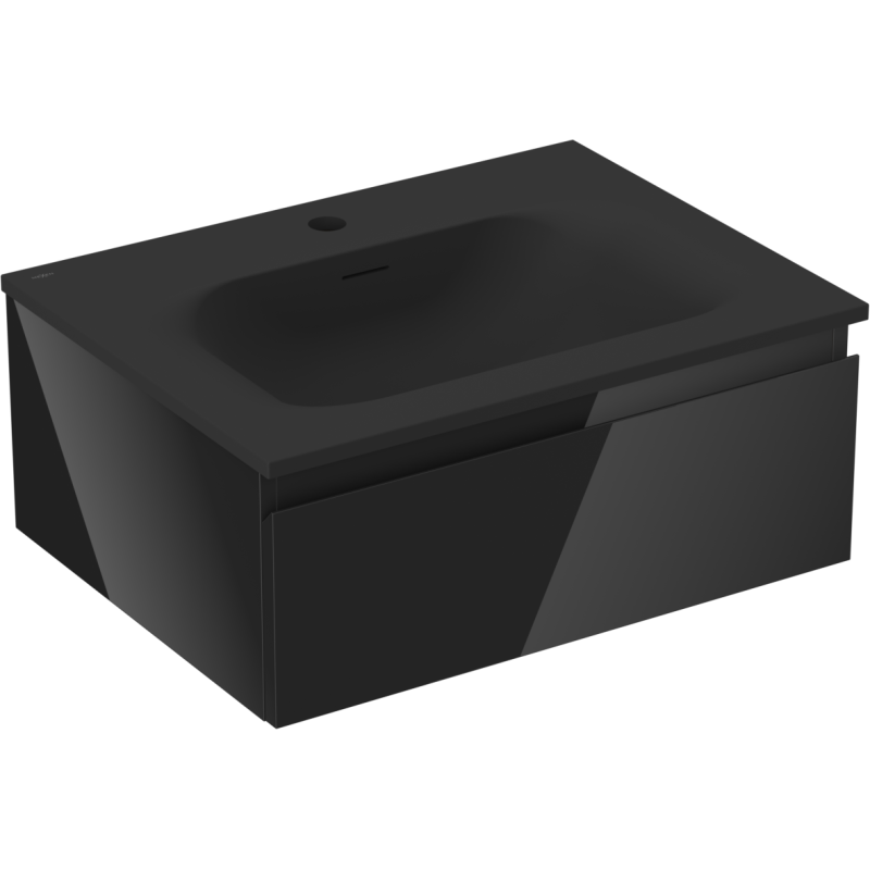 Dette baderomsskapet med servant har et korpus og en front i svart høyglans som gir et eksklusivt uttrykk, mens den svarte matte vasken skaper en elegant kontrast. Skapet er designet for veggmontering, noe som gir et lett og moderne preg samt enklere renhold under møbelet.