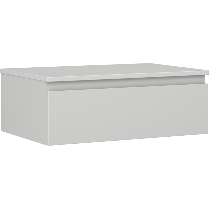 Skuffen er utstyrt med et moderne system for myk og stille lukking (soft-close), som gir komfortabel og lydløs bruk, samtidig som det skåner både beslag og møbel over tid. Både korpus og toppplate har en lakkert overflate som er motstandsdyktig mot UV-stråler, noe som bidrar til at fargen grå matt holder seg pen og jevn over lang tid, selv i lyse baderom.