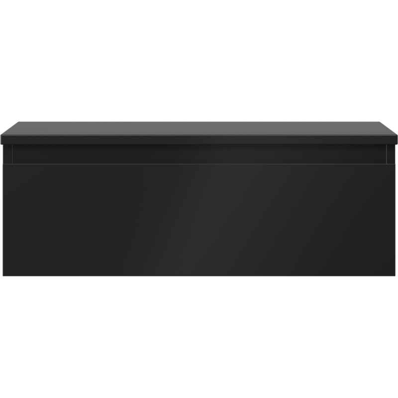 Korpus på servantskapet er utført i svart matt, laget av lakkert møbelplate, mens fronten er produsert i lakkert MDF-plate med glatt overflate i samme svarte matte farge. Både korpus og front har UV-bestandig overflate som beskytter fargen mot falming og sikrer et varig, elegant utseende. Med kompakte mål og horisontal utforming passer dette servantskap til bad perfekt under en toppmontert servant der du ønsker et minimalistisk og moderne preg.