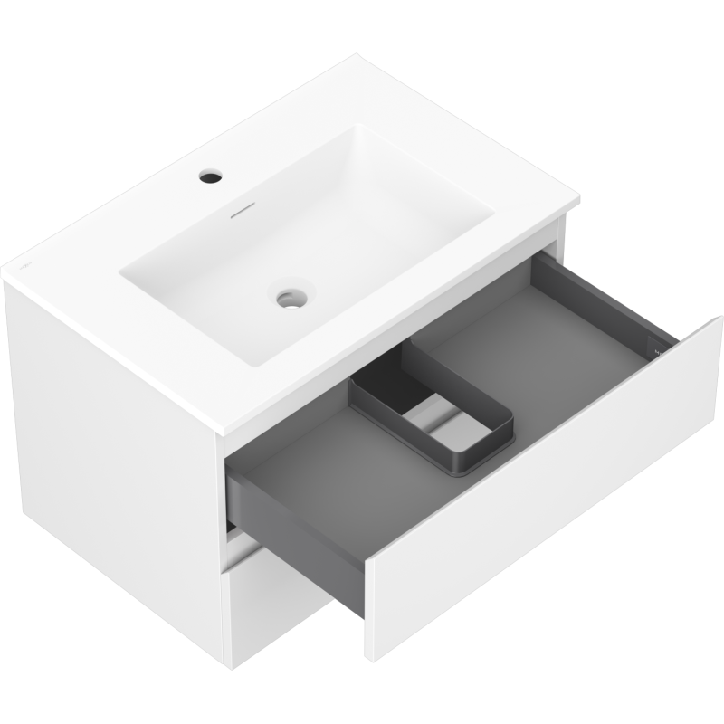 Korpus er laget av lakkert plate i hvit matt utførelse, mens frontene er produsert i lakkert MDF med glatt struktur. Dette gir et robust og slitesterkt baderomsmøbel med skuffer som tåler daglig bruk, samtidig som den matte overflaten gir et eksklusivt preg.