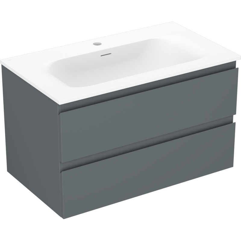 Skapet har en bredde på 80 cm, dybde på 46 cm og høyde på 47 cm, noe som gir god lagringsplass uten å ta for mye plass i rommet. Korpuset er utført i lakkert plate i grafitt matt, mens frontene er laget av lakkert MDF i samme grafittfarge med glatt overflate. Den medfølgende Vela-servanten i hvit matt konglomerat gir en elegant kontrast og gjør dette til et komplett baderomsskap med servant som fremstår både tidløst og moderne.