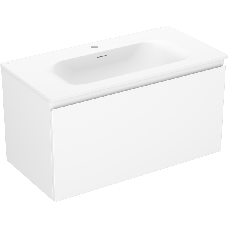 Servantskapet er et hengende baderomsskap som monteres på vegg, noe som gir et luftig inntrykk og gjør det enklere å holde rent under møbelet. Korpus er produsert i lakkert plate i hvit matt utførelse, mens fronten er laget av lakkert MDF-plate med glatt struktur. Sammen med den tilpassede Vela-servanten i hvit matt konglomerat får du et helhetlig baderomsmøbel med skuff som utnytter bredden på 90 cm optimalt.