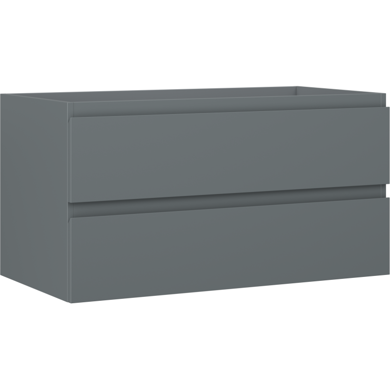 De to romslige skuffene gir ryddig og lett tilgjengelig oppbevaring, samtidig som den glatte fronten i grafitt matt gjør rengjøringen enkel. Systemet for myk lukking sikrer stille og kontrollert lukking, noe som er spesielt praktisk i husholdninger der baderommet brukes mye. Den vegghengte løsningen gir dessuten enklere renhold av gulvet under skapet og bidrar til et luftig og moderne uttrykk i baderommet.