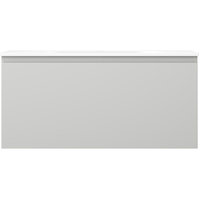 Fronten i lakkert MDF og korpus i lakkert plate gir en slitesterk overflate. Både korpus og front har en matt grå finish som gir et moderne uttrykk og harmonerer godt med den hvite matte komposittservanten. Overflaten på møbelet er motstandsdyktig mot UV-stråler, noe som gir økt fargebestandighet og beskytter mot falming over tid.