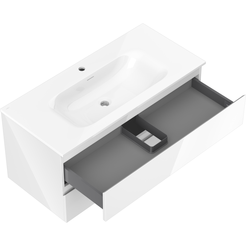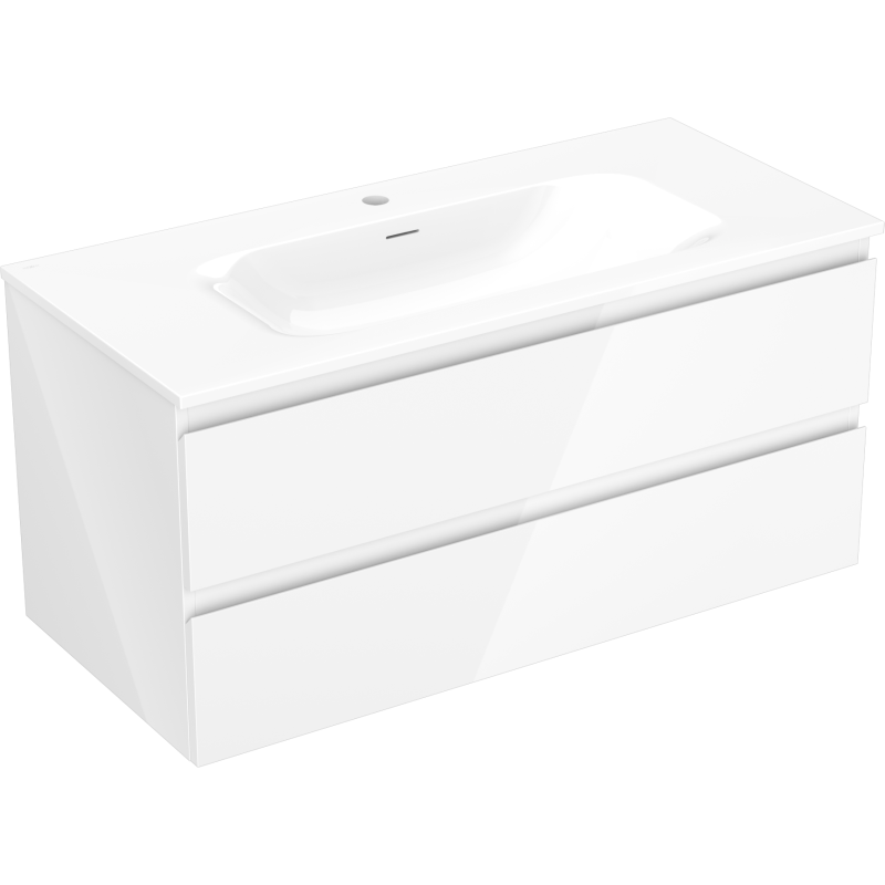 Selve skapet har en bredde på 100 cm, dybde på 46 cm og høyde på 47 cm, og er utstyrt med to romslige skuffer. Både kropp og fronter er utført i lakkert plate i hvit høyglans, med glatte fronter uten profilering. Vela-servanten er tilpasset skapet på 100 cm og har integrert kranhull og overløp, slik at du får et praktisk og komplett baderomsskap med servant som er klart til montering av armatur.