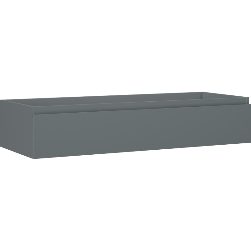 Servantskapet har en bredde på 120 cm, høyde på 23,5 cm og dybde på 46 cm, noe som gjør det godt egnet både til større og mellomstore baderom. Korpus er laget av lakkert plate i fargen grafitt matt, mens fronten er produsert i lakkert MDF-plate i samme grafitt matte utførelse. Den glatte fronten gir et minimalistisk uttrykk og passer perfekt inn i moderne baderomsinnredninger.