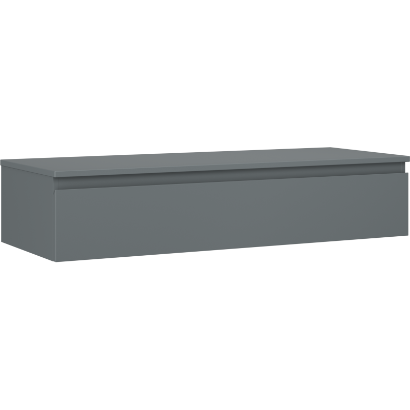 Servantskapet har en bredde på 120 cm, høyde på 23,5 cm og dybde på 46 cm, noe som gir en slank og lett uttrykksfull profil på veggen, samtidig som det gir god oppbevaringsplass. Korpus er produsert i lakkert plate, mens fronten er laget av lakkert MDF-plate med glatt struktur, noe som gir en jevn og enkel rengjøringsflate. Dette servantskapet til bad er et godt valg for deg som ønsker et minimalistisk og funksjonelt baderomsmøbel i grafitt matt.