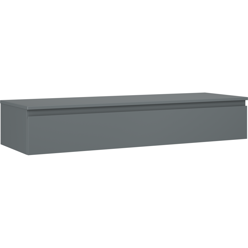 Servantskapet leveres i fargen grafitt matt, både på korpus og front, med en glatt front som understreker det rene designet. Korpuset er produsert i lakkert plate, mens fronten og benkeplaten er laget av lakkert MDF, noe som gir en stabil og slitesterk konstruksjon. Dette servantskapet til bad er ideelt for deg som ønsker et stort servantskap 140 cm med god oppbevaringsplass og fleksibilitet til å velge servant selv.