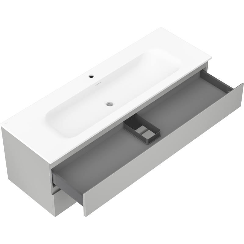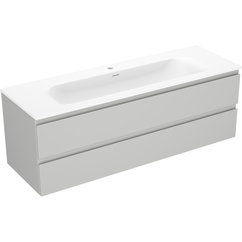 Vela-servanten i hvit matt utførelse er spesialtilpasset dette servantskapet 140 cm, og gir en pen kontrast til det grå skapet. Kombinasjonen av grå og hvit matt overflate gjør dette til et ideelt grå-hvitt servantskap for moderne baderomsløsninger.