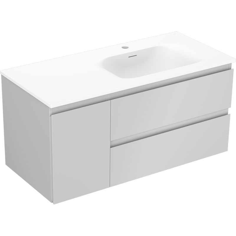 Dette baderomsskap med servant er bygget opp av to separate underskap: et 70 cm bredt skuffeskap og et 30 cm bredt skap med dør, som sammen gir en total møbelbredde på 100 cm. Frontene er glatte og minimalistiske, noe som understreker det moderne uttrykket og gjør møbelet lett å kombinere med annet interiør. Servanten i slitesterk konglomerat har integrert hull for blandebatteri og overløp, og er tilpasset høyreplassering av kum (Vela-servant høyre).