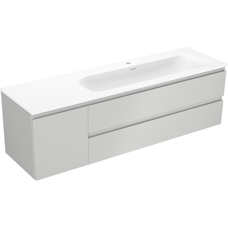 Vela-servanten i hvit matt utførelse er utstyrt med både overløpshull og hull for armatur, noe som gir ekstra sikkerhet mot overfylling og gjør monteringen av servantbatteri enkel. Kombinasjonen av grå matt servantskap og hvit matt komposittservant gir et eksklusivt og tidløst preg på badet.