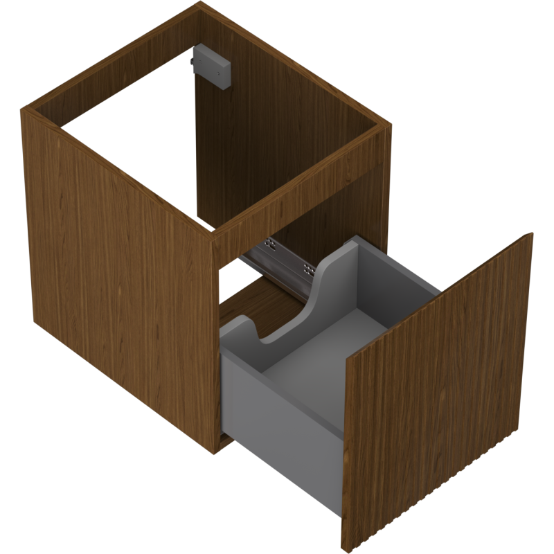 Dette underskapet til servant er konstruert med fokus på slitestyrke og komfort i bruk, og fungerer utmerket som servantskap til bad i hverdagen. Korpus er laget av plate belagt med PVC-folie, som gir en jevn og motstandsdyktig overflate. Fronten er produsert i MDF-plate med PVC-folie og har en dekorativ, riflet struktur som gir et eksklusivt preg.