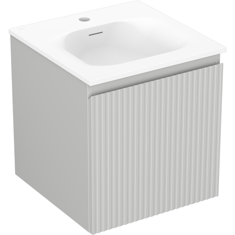 Servantskapet har en riflet front i grå matt utførelse som gir et eksklusivt og tidsriktig uttrykk. Korpus er i grå matt lakkert plate, mens fronten er laget av lakkert MDF. Den medfølgende Vela-servanten i hvit matt konglomerat skaper en elegant kontrast til det grå matte baderomsmøbelet og gjør helheten til et moderne baderomsskap med servant.