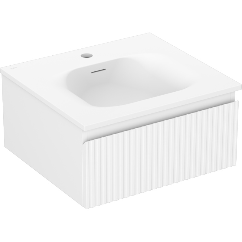Mexen Rivel er et moderne, vegghengt baderomsmøbel med en bredde på 50 cm, levert som komplett servantskap med vask. Møbelet kombinerer funksjonalitet med et elegant, riflet frontdesign i hvit matt utførelse, og passer perfekt i små og mellomstore bad der du ønsker et stilrent baderomsskap med servant.