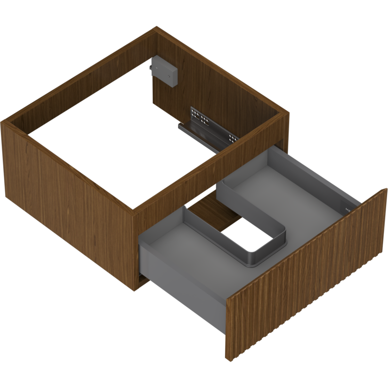 Skuffen er laget av MDF-plate belagt med PVC-folie, med en dekorativ riflet front som understreker det moderne designet. Myk-lukk-funksjonen (dempet lukking) sørger for at skuffen lukkes mykt og stille, uten harde smell, noe som både øker komforten og beskytter møbelet mot slitasje. Dette gjør Mexen Rivel servantskap til et gjennomtenkt valg for et stilrent og brukervennlig bad.