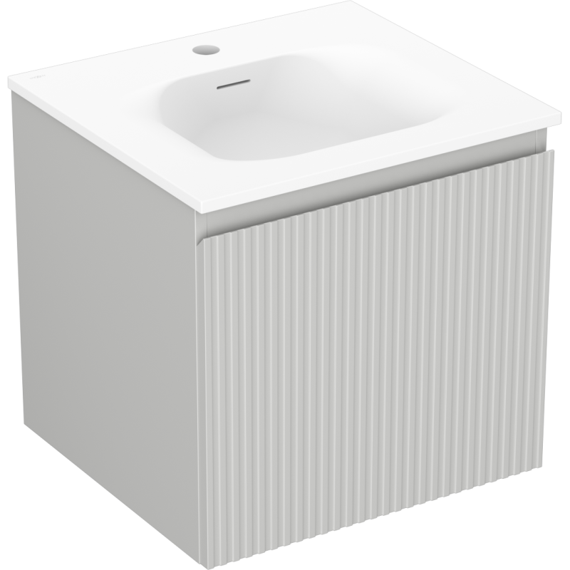 Det moderne, rette designet med riflet front gjør at dette baderomsskapet med servant enkelt kan kombineres med andre baderomsmøbler og tilbehør. Den nøytrale fargekombinasjonen grå matt/hvit matt gir fleksibilitet ved valg av fliser, armaturer og speil, slik at du får et helhetlig og moderne uttrykk på badet.