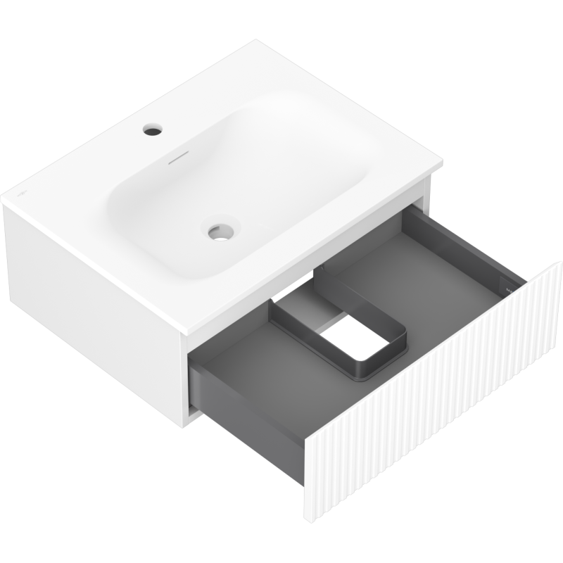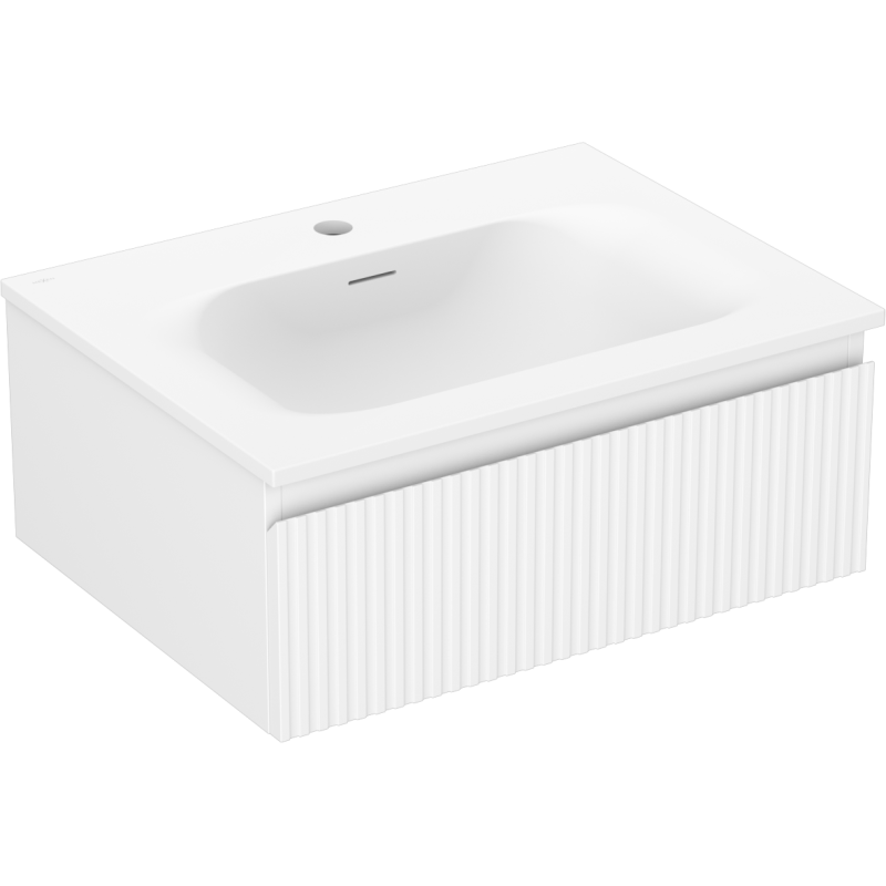 Servantskapet har et helhetlig hvit matt uttrykk, med korpus i lakkert plate og front i lakkert MDF med dekorativ, riflet struktur som gir et eksklusivt og moderne preg. Den medfølgende Vela-servanten i hvit matt konglomerat er nøye tilpasset skapet og gir en harmonisk og sammenhengende løsning. Baderomsskap med servant i denne utførelsen passer spesielt godt i moderne bad der rene linjer og enkel rengjøring er viktig.