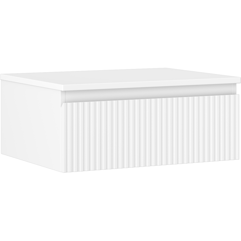 Servantskapet leveres i hvit matt utførelse på både korpus og front, noe som gir et tidløst uttrykk og passer godt inn i lyse, moderne baderom. Fronten har en dekorativ riflet struktur som tilfører eksklusivitet og dybde til møbelet. Med en lav høyde på 23,5 cm og dybde på 46 cm gir dette servantskapet til bad et lett og svevende inntrykk, samtidig som det gir praktisk oppbevaringsplass.
