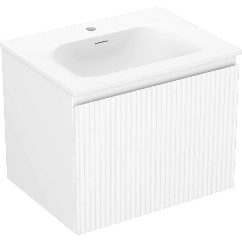 Dette servantskapet 60 cm er utstyrt med én stor, romslig skuff som gir god oppbevaringsplass til daglige baderomsartikler. Skuffen har et moderne system for dempet lukking (myk lukking), som sørger for stille og kontrollert lukking, reduserer slitasje og øker komforten i hverdagen. Den riflete fronten i hvit matt MDF gir et eksklusivt preg og passer godt inn i et moderne baderomsmiljø.