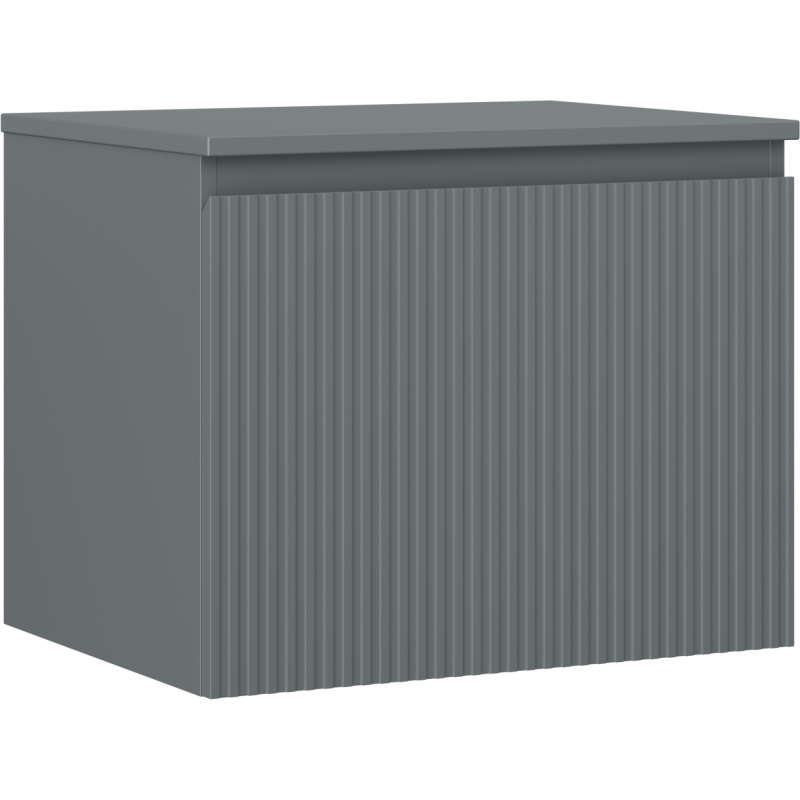 Servantskapet har en bredde på 60 cm, høyde på 47 cm og dybde på 46 cm, og kommer i fargen grafitt matt. Korpus er produsert i lakkert plate, mens fronten er laget av lakkert MDF med riflet struktur, noe som gir et eksklusivt og moderne uttrykk. Toppplaten i lakkert MDF er tilpasset montering av toppmonterte servanter og skaper et helhetlig baderomsmøbel i grafitt.