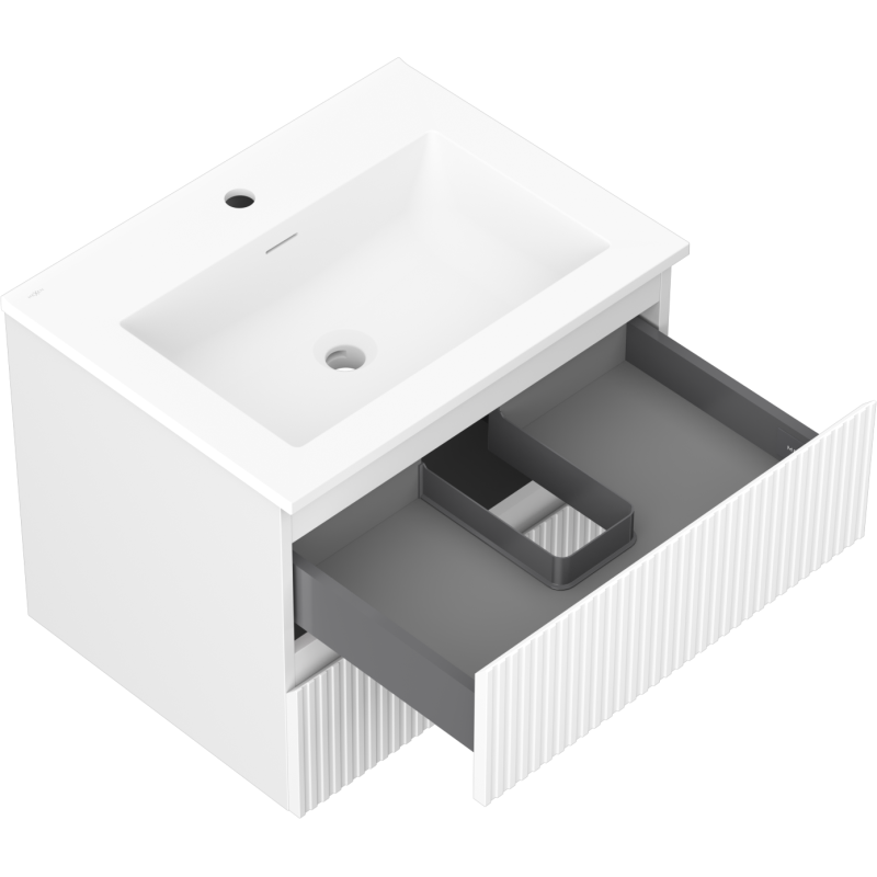 Dette servantskapet 60 cm er utstyrt med to romslige skuffer som gir god oppbevaringsplass til daglige baderomsartikler. Skuffene har integrert dempesystem for myk lukking, som sørger for myk og stille lukking, reduserer slitasje og øker komforten i hverdagsbruk. Den riflete frontstrukturen gir et moderne og taktilt preg, samtidig som den hvite matte finishen gjør at møbelet enkelt kan kombineres med ulike interiørstiler.