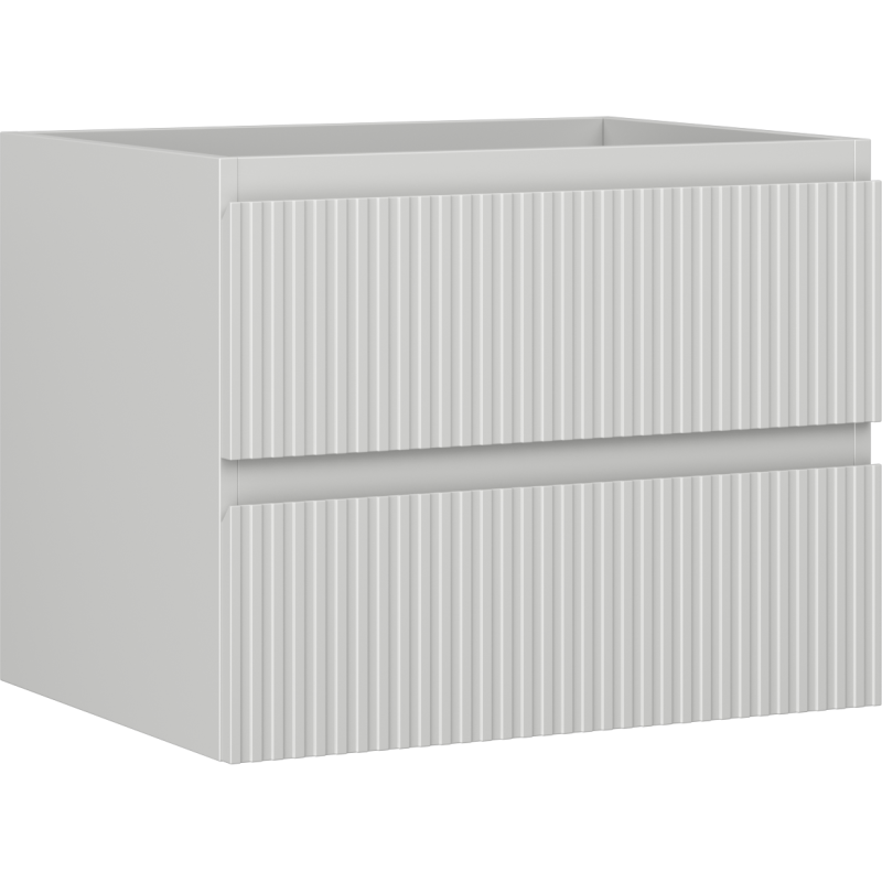 Servantskapet har en bredde på 60 cm, høyde på 47 cm og dybde på 46 cm. Korpus er laget av lakkert plate i grå matt, mens frontene er produsert i lakkert MDF-plate i samme grå matte farge. De dekorative, riflede frontene gir et eksklusivt og tidsriktig utseende, samtidig som helheten gjør dette til et praktisk servantskap til bad som er lett å kombinere med ulike baderomsstiler.
